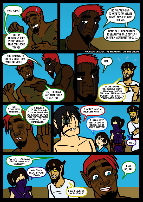 Cultural tensions aside, there's no skirting the truth: Plain and simple, Diyero's dad is a racist. Understandably so, as you'll soon see, but it doesn't change the fact that he has a strong, deep bias against the entirety of the Druden race. I guess it's a good thing there are no Drude in the party, eh? Despite Jabin's faults, he's a fun character, and I hope you readers we grow to enjoy him as much as me and Carissa do. :D