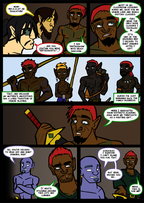 Recognize the first guy in panel 3? Give up? It's Zahran, from the dream sequence in chapter 1. Whoo past references! He's also been mentioned in Penda's storytelling.