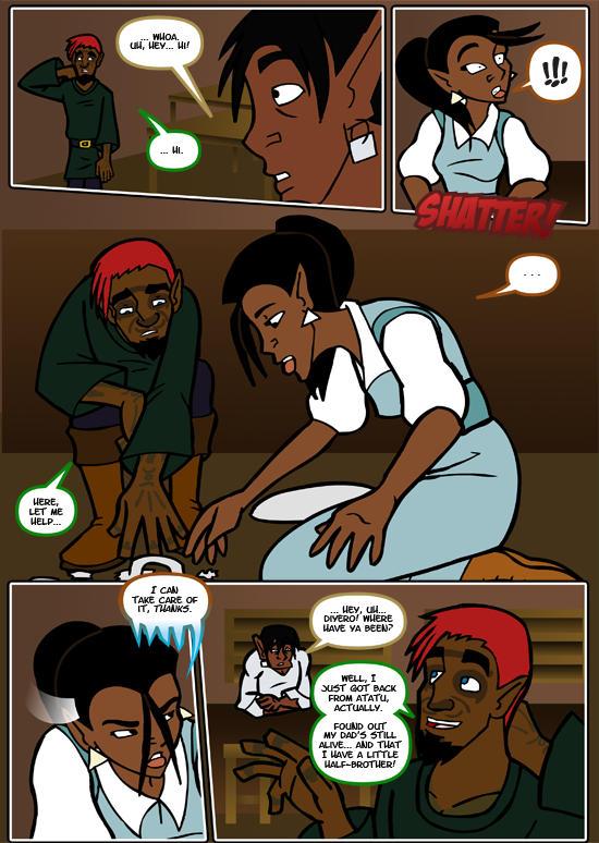 I fiddled with several different possibilities for the "icy" speech in panel 4. I'm still not 100% sure this feels quite right, but it works well enough. I'd think it's pretty clear Kalau is surprised and NOT happy to see Diyero again.