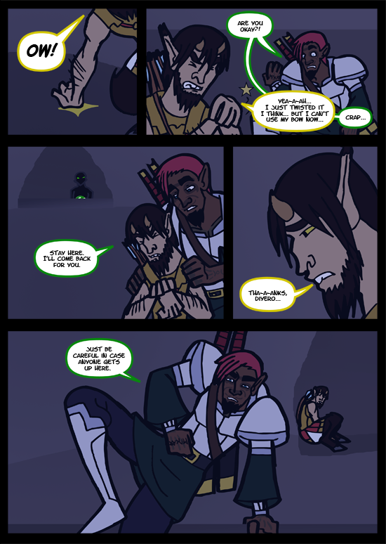 Briana wanted to make Rune Master realistic. Myron gets hurt here not only as a plot device, but because she was determined to get every character hurt at some point especially since they'll be in so many battles and coming out unscratched is unrealistic. Hopefully Ehrdi is like the One Piece world: all wounds, no matter how serious, can be cured....with bandages! No matter what. (I love you One Piece <3 )