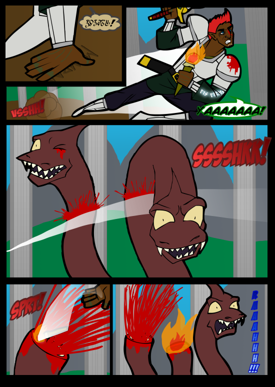 That being said, I can still handle a fair level of violence in cartoons/some comics. Blood by itself doesn't bother me much at all. Also, demon and monster slaying's a dirty business... And I have to admit, drawing the blood spurts from the hydra's neck was pretty fun.