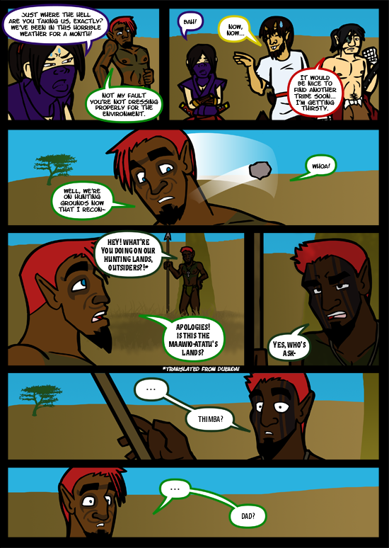 If you look in panel two, you'll something that was hidden before: Kogeru has a hairy belly button. XD And here's new character number one! Looks like Diyero's daddy's still alive! How will this reunion go?