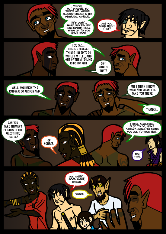 I don't think I've bothered to explain yet why Sauda's hair is only dyed in streaks, rather than her whole head, right? Well, in Sauda's village, it was tradition for the unmarried adult women to only partially dye their hair. When they married, they would dye the rest of their hair to symbolize becoming a "full" woman. Even though Sauda and Jabin are married, they both found they liked her hair better in streaks and kept it that way. So it's mostly a cosmetic choice at this point.