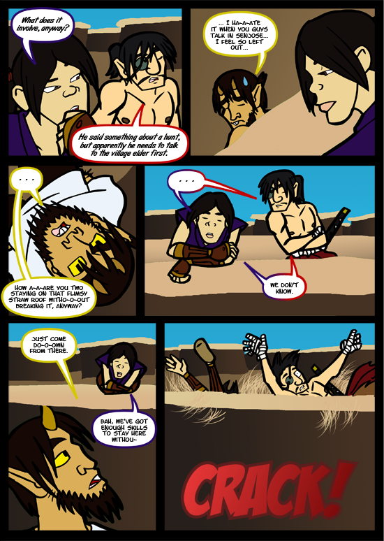 Now, when we originally wrote this scene, Carissa had Kogeru and Hikari observing from the roof because that's what they normally do, right? Well, she forgot that the huts have straw roofs and wouldn't hold up too well against that. Me... I remembered this, but rather than correct Carissa, I figured this route was better. I don't reqret my choice.