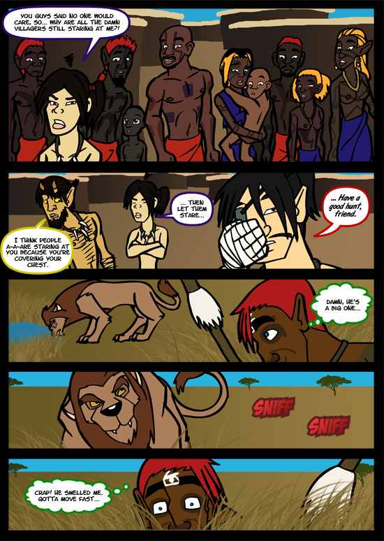 My buddy Jermaine appears again in panel 1 (the "light-skinned" Duendo in the center)! This time accompanied by his wife and son (who was also in a previous page). If you're wondering why Jermaine is bald here when it's generally only children who don't have hair, the reasons for this are twofold: 1. He's bald in real life, so I wanted his in-comic representation to be more accurate than the flashback one; 2. While baldness is associated with childhood, sometimes adult Duendo shave their heads as a sign of mourning. You can take Jermaine's RM-counterpart as being bald in reverance of those who died during the slaver raid.