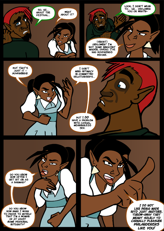 Yup, Kalanu wasn't a virgin, despite impressions I know some of you had. Why the shyness over Diyero's attentions earlier? Well, Kalanu hasn't had a relationship in a long time, and it's also normal for her to be a bit flustered by attraction.