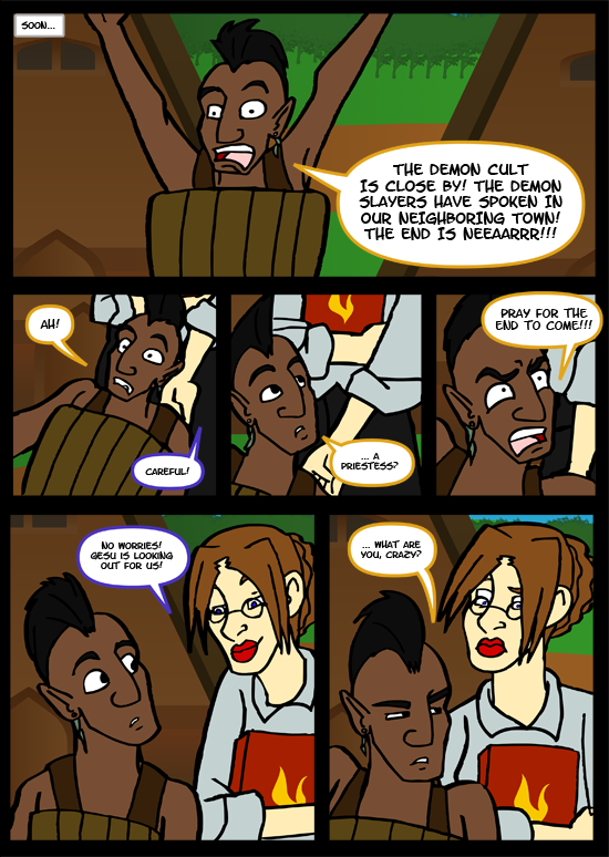 I love that barrel guy...and his awesome hair. I want to touch it... ...Oh yeah! Maggie's back. Briana decided her Victorian-ish look didn't exactly fit Ehrdi, but never fear! Her old clothes are safely stored away in her shirt and in secret compartments under her skirt. Yup. She's magical like that.