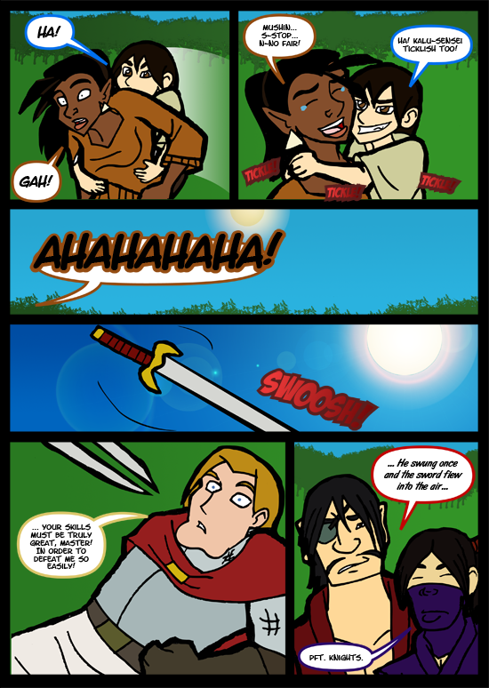 This scene originally had a little more between Mushin and Kalanu, but after looking it over, I felt it was uneeded - the point was to show the two of them bonding and having a good time while the others are